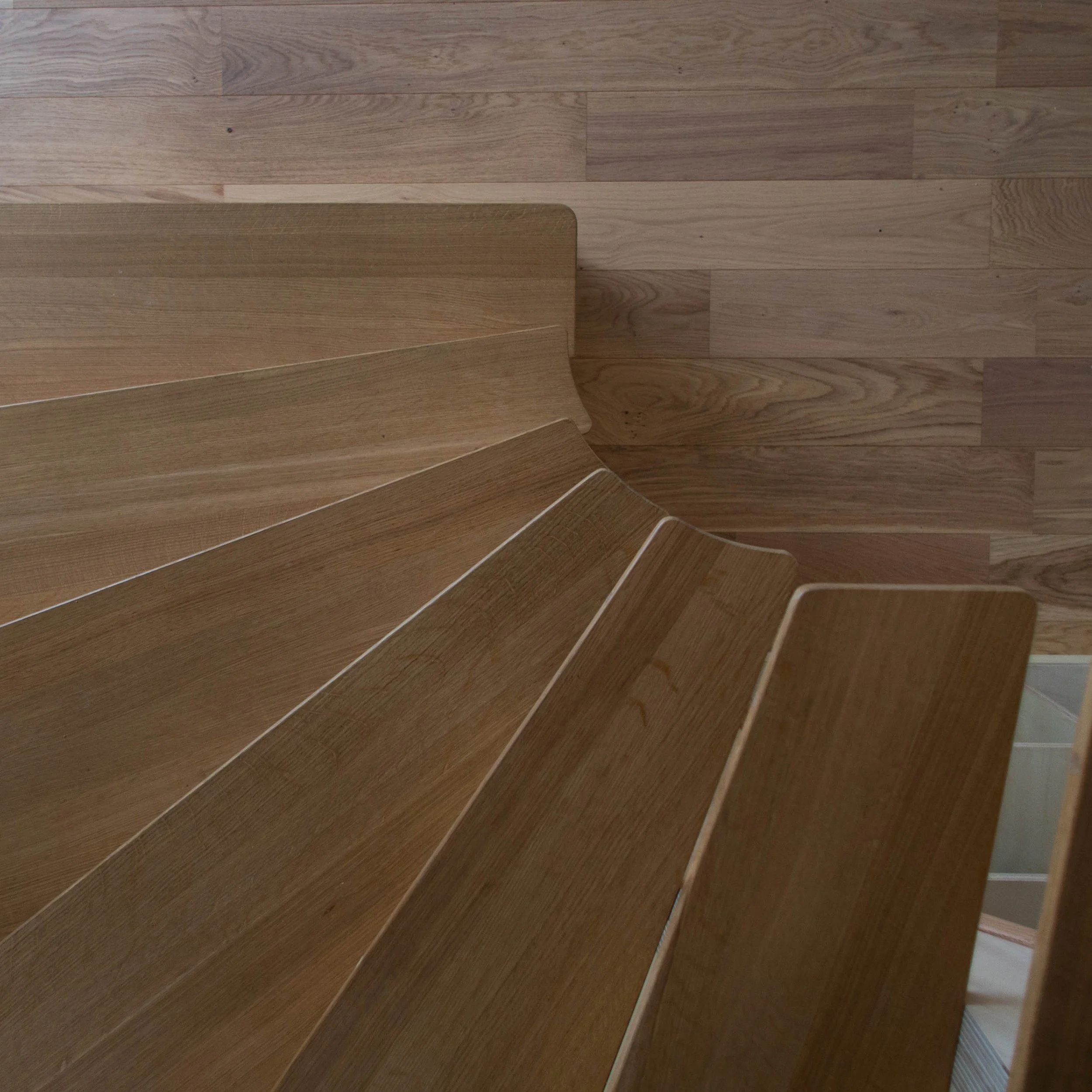 Escalier / Bibliotheque : Conception et réalisation d’un escalier quart de rond, marches balancées. Cloisons rangement et tête de lit